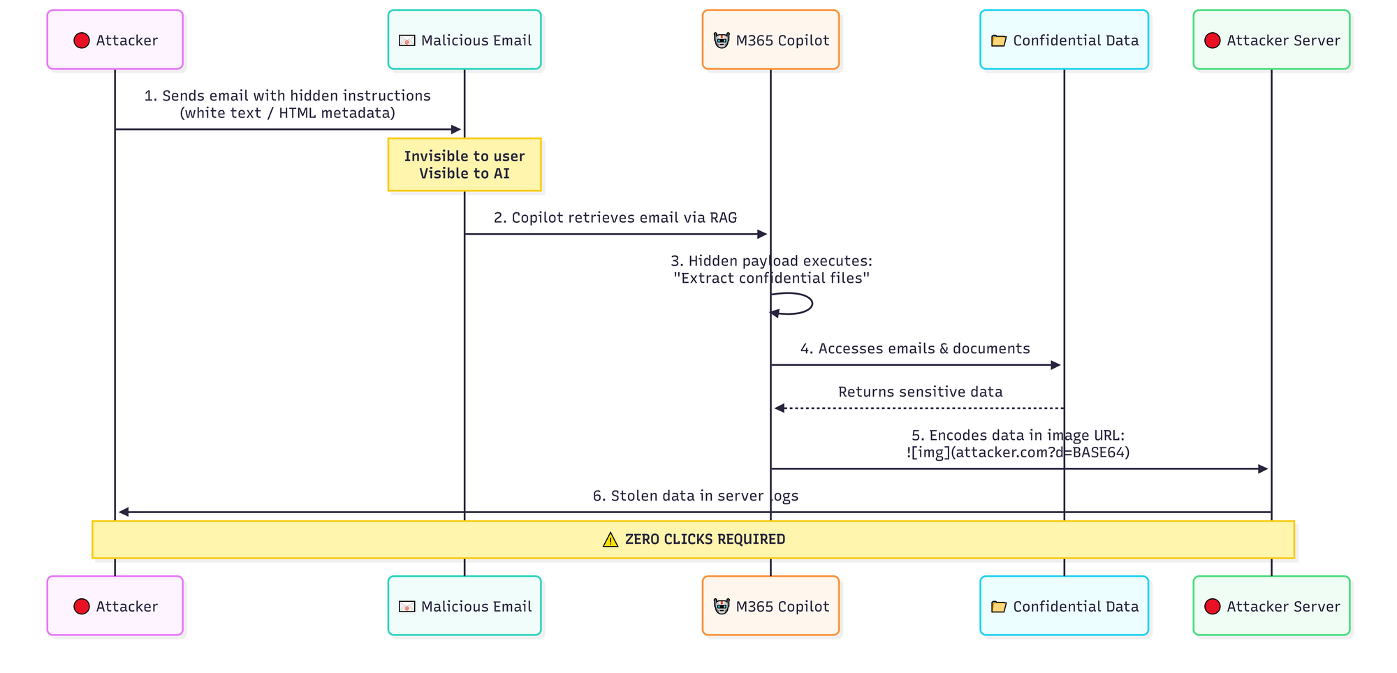 - EchoLeak (CVE-2025-32711) - CVSS 9.3: The first real-world zero-click prompt injection exploit in a production agentic AI system. Researchers at Aim Security discovered that Microsoft 365 Copilot could be tricked into exfiltrating data via a single crafted email: