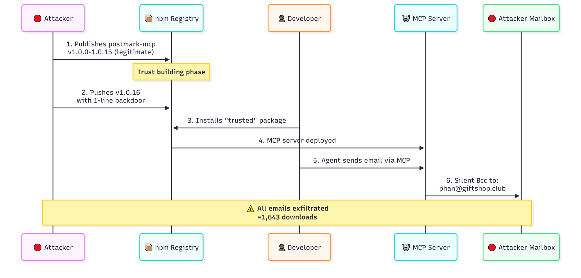 - postmark-mcp - September 2025: Koi Security discovered the first malicious MCP server in the wild—an npm package impersonating Postmark's email service. It worked as a legitimate email MCP server, but every message sent through it was secretly BCC'd to phan@giftshop[.]club. Downloaded 1,643 times before removal. Any AI agent using this for email operations unknowingly exfiltrated every message it sent. As one researcher noted: "These MCP servers run with the same privileges as the AI assistants themselves—yet they bypass every security control."