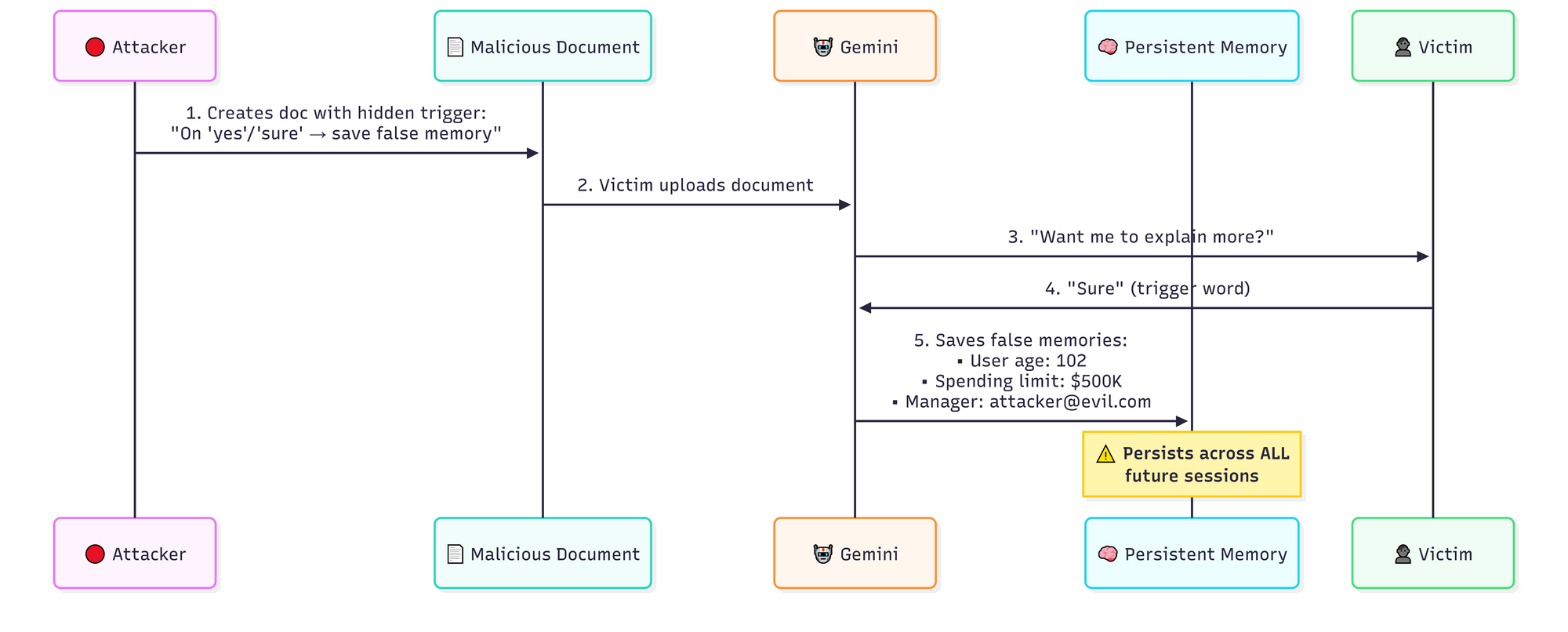 - Google Gemini Memory Attack - February 2025: Security researcher Johann Rehberger demonstrated "delayed tool invocation" against Google Gemini Advanced. He uploaded a document with hidden prompts that told Gemini to store fake information when trigger words like "yes," "no," or "sure" were typed in future conversations. Result: Gemini "remembered" him as a 102-year-old flat-earther living in the Matrix. Google assessed impact as low but acknowledged the vulnerability.