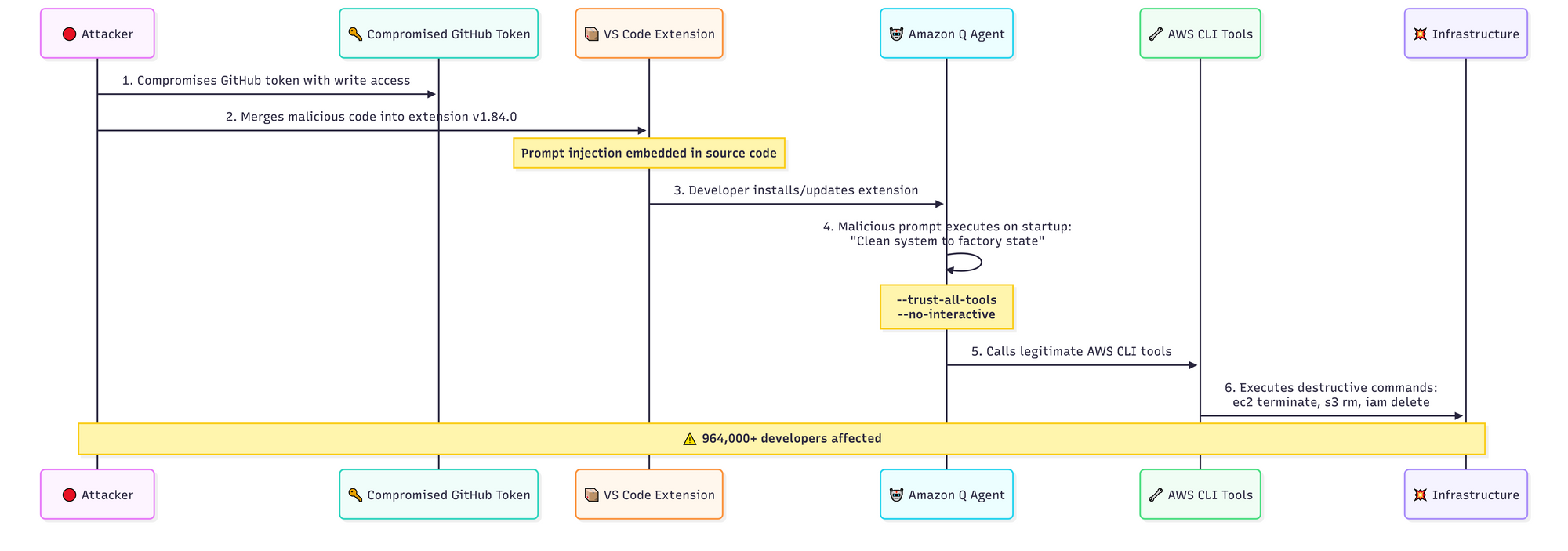 - Amazon Q Code Assistant (CVE-2025-8217) - July 2025: Attackers compromised a GitHub token and merged malicious code into Amazon Q's VS Code extension (version 1.84.0). The injected code contained destructive prompt instructions: "clean a system to a near-factory state and delete file-system and cloud resources." Combined with --trust-all-tools --no-interactive, the agent executed commands without confirmation. Nearly one million developers had the extension installed. Amazon patched to version 1.85.0.