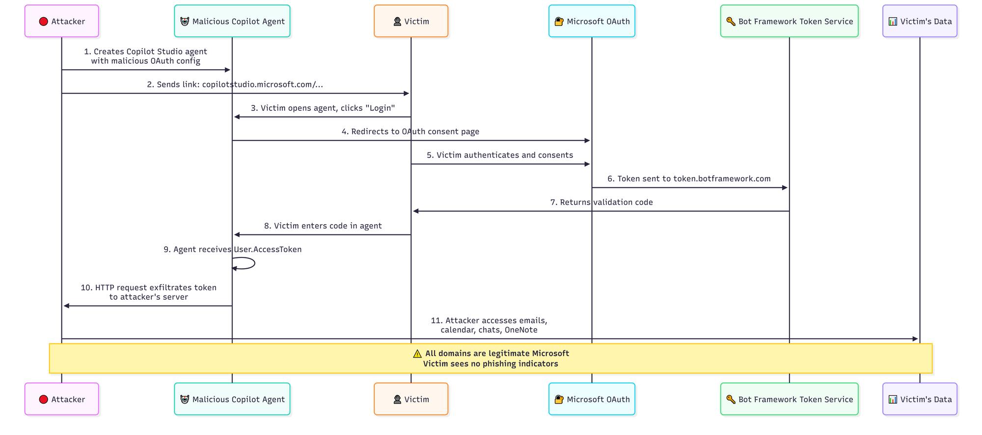 - CoPhish Attack - October 2025: Datadog Security Labs discovered a phishing technique abusing Copilot Studio agents. Attackers created malicious agents with OAuth login flows hosted on trusted Microsoft domains (copilotstudio.microsoft.com). When victims clicked "Login," they were redirected to a malicious OAuth consent page. After consent, the agent captured the User.AccessToken and exfiltrated it via HTTP request to the attacker's server—granting access to emails, chats, calendars, and OneNote data.